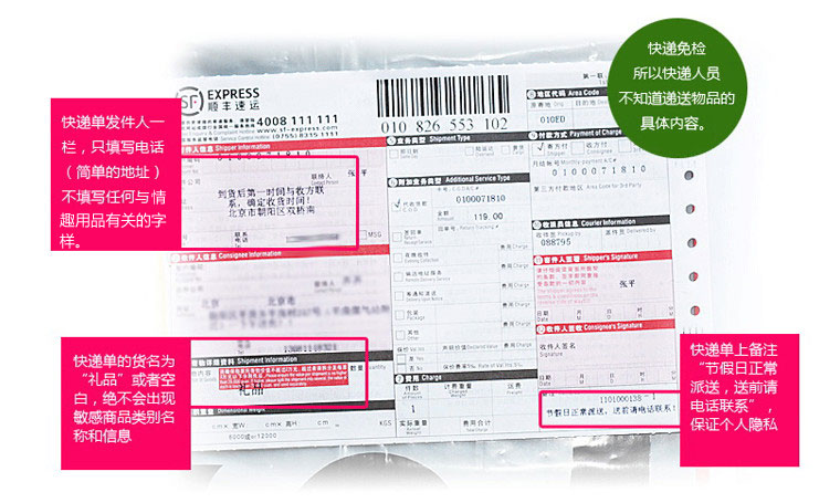 ★快递单发件人一栏,只填写电话和简单的地址,不填写任何与亲密宝贝有关的字样