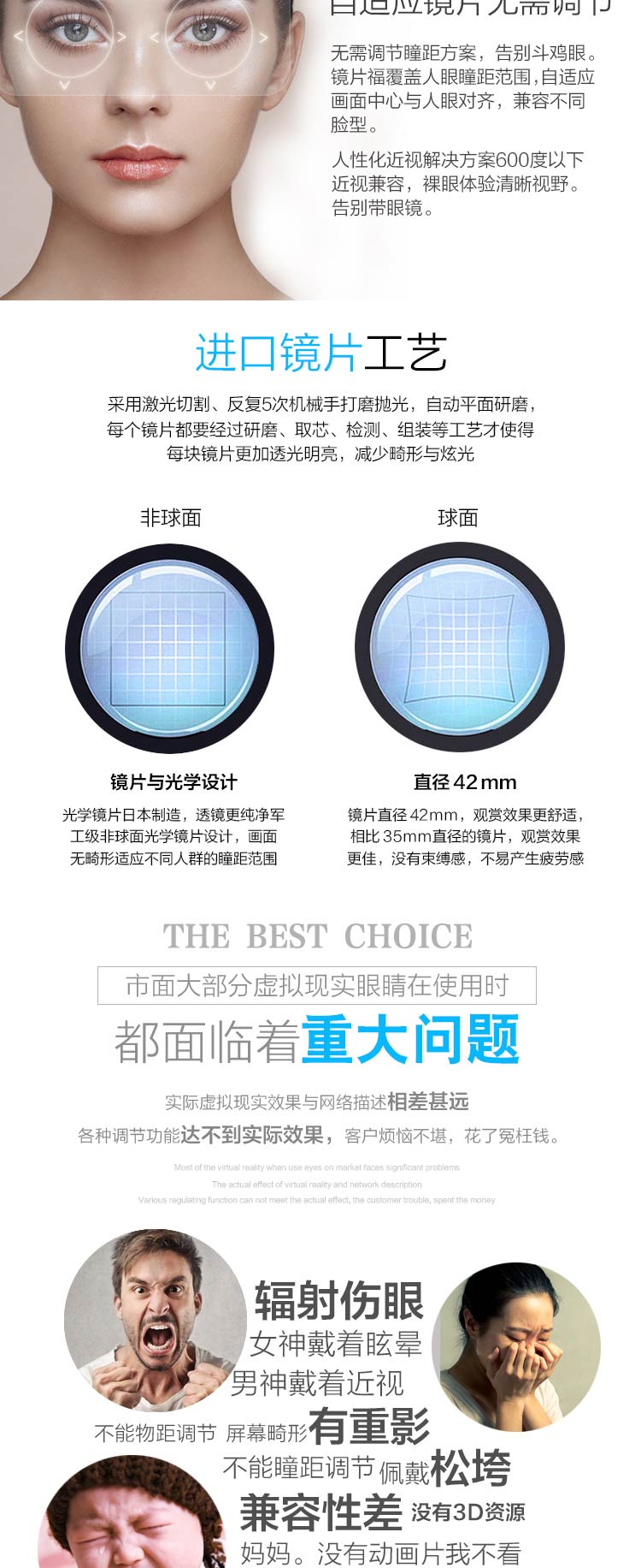 这款VR,佩戴舒适,观影效果极佳!外资源真的很丰富!足够丰富!好产品中国造,看3D电影就像随身影院一样,装了好几款app,都很好用,效果佳!优质的视频和像素高的具有更加效果!视频清晰度跟视频源很清晰,资源还是够看好长时间。备受享受! 服务包装送货俱佳,享受生活、享受娱乐,享受温馨服务
