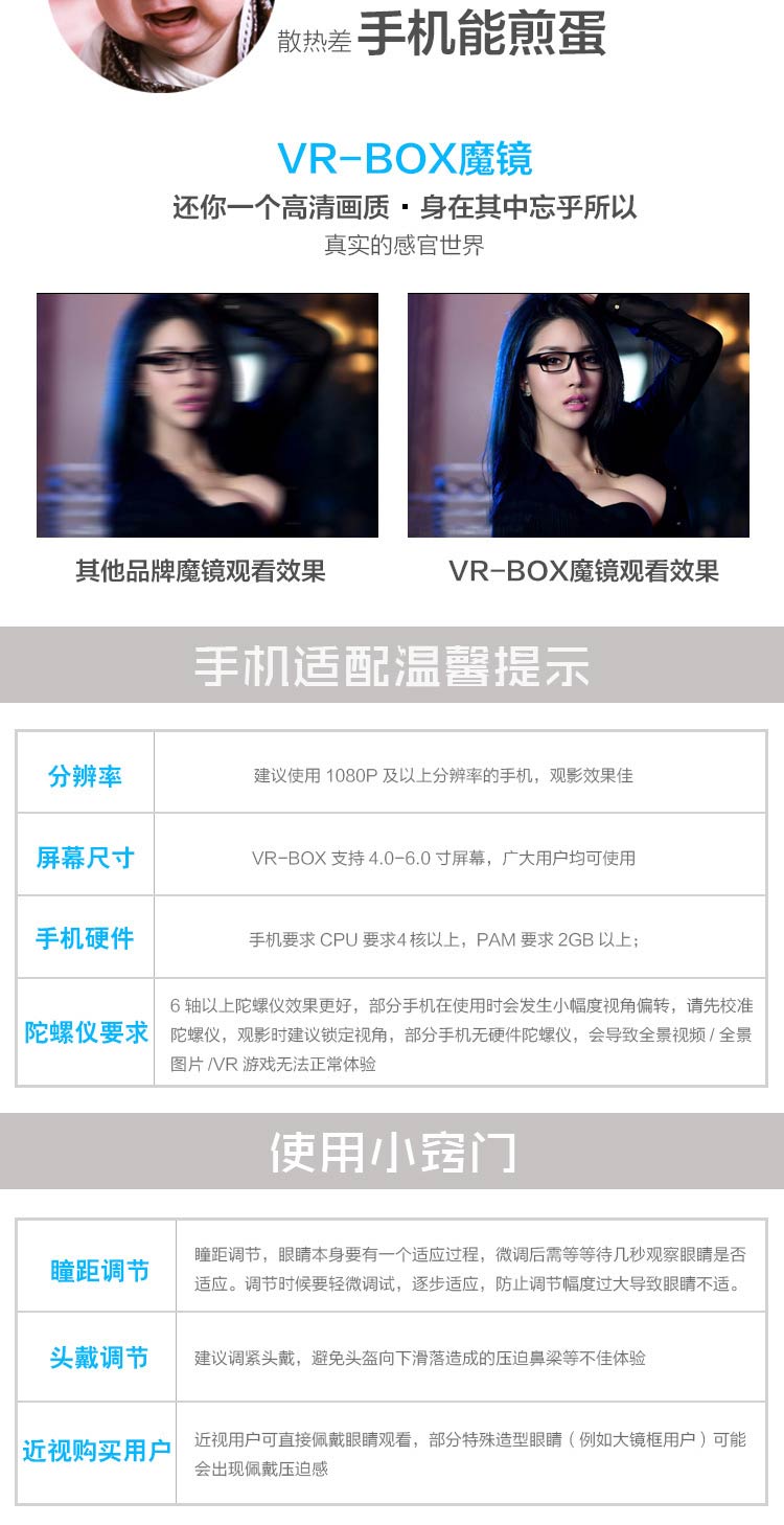 东西收到了 用了两天才来评价 本来抱着当玩具玩玩的心态买的 不过用过后感觉确实不错 体验很好 看了几部电影 感觉很不错 和电影院有的一拼 想体验vr的值得一买 真实评价