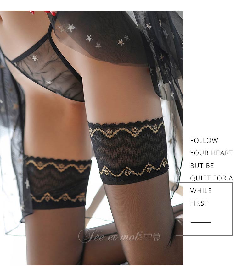 霏慕15D含硅胶油亮蕾丝花边长筒袜7235