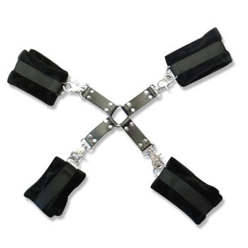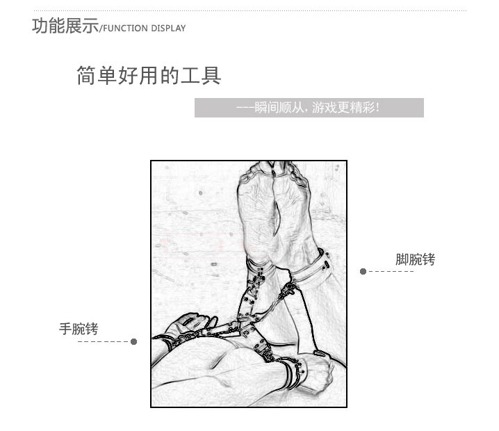 激情性爱游戏手铐、脚铐间用金属链连接着,松紧可自由调节。柔软材质制作,既舒适又安全。